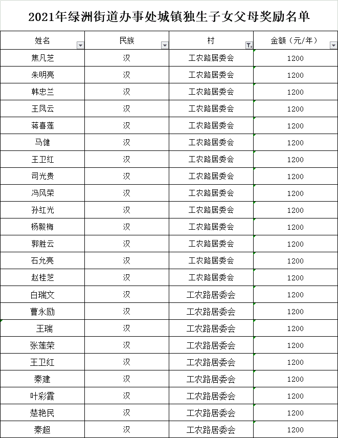 2021年绿洲街道办事处城镇独生子女父母奖励名单