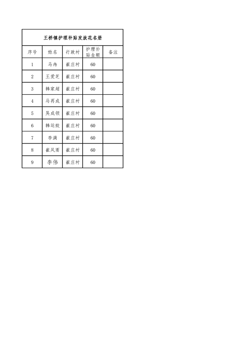 王桥镇2022年1月份护理补贴 崔庄村