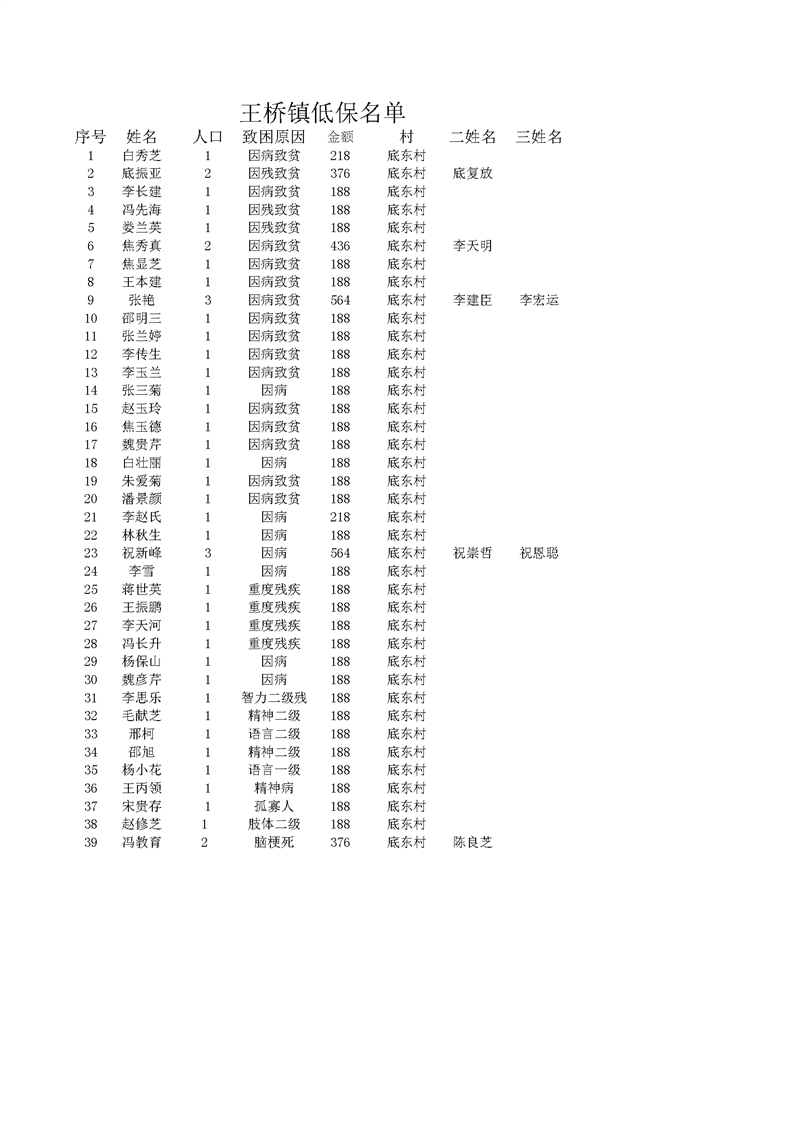 王桥镇2022年2月低保名单 底东村