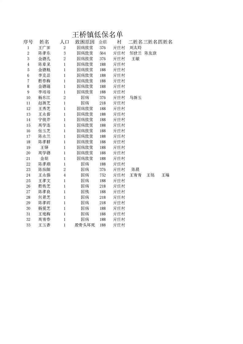 王桥镇2022年2月低保名单 亓庄村