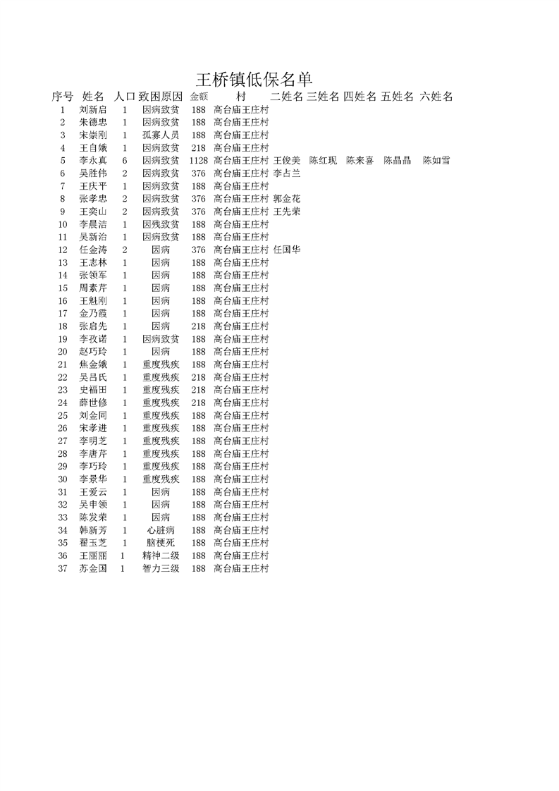 2022年3月王桥镇低保发放名单 高台庙王庄