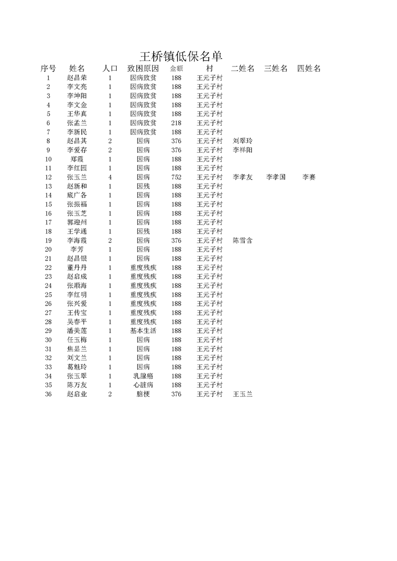 2022年3月王桥镇低保发放名单 王元子