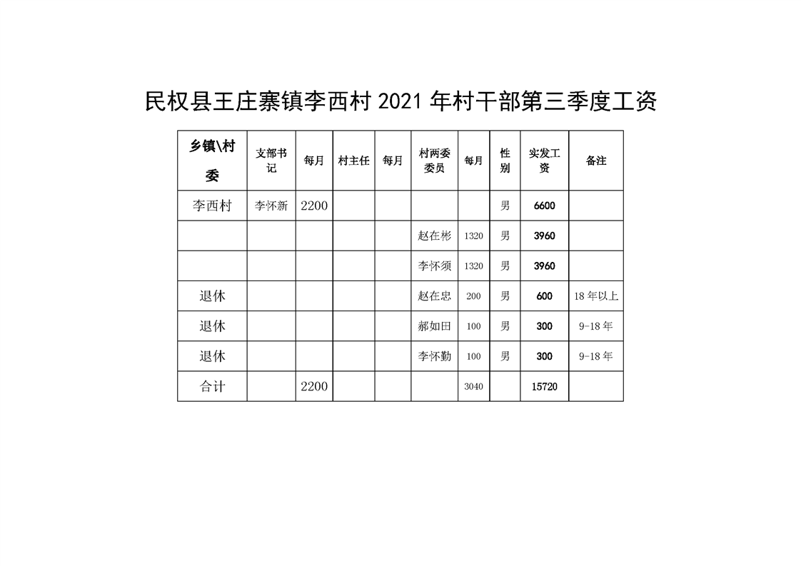 民权县王庄寨镇李西村2021年村干部第三季度工资