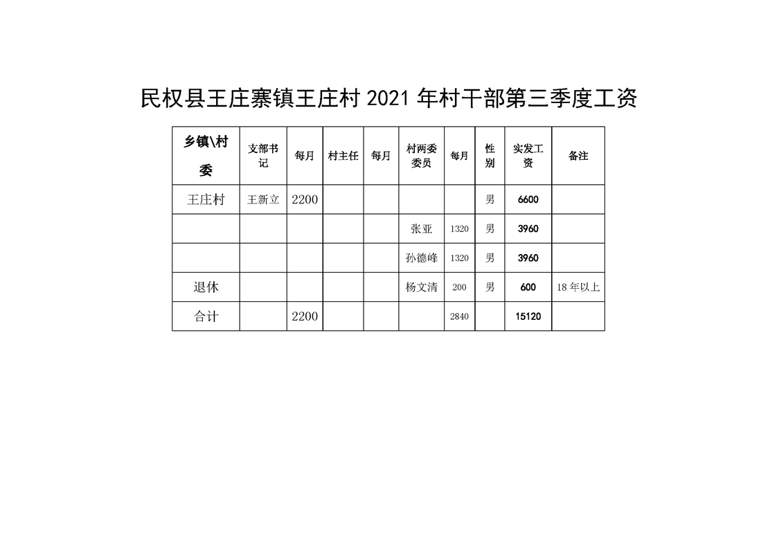 民权县王庄寨镇王庄村2021年村干部第三季度工资