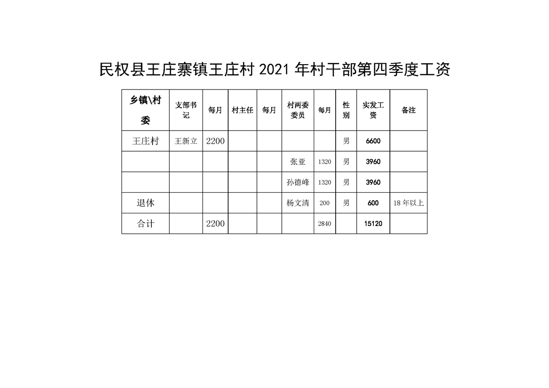 民权县王庄寨镇王庄村2021年村干部第四季度工资