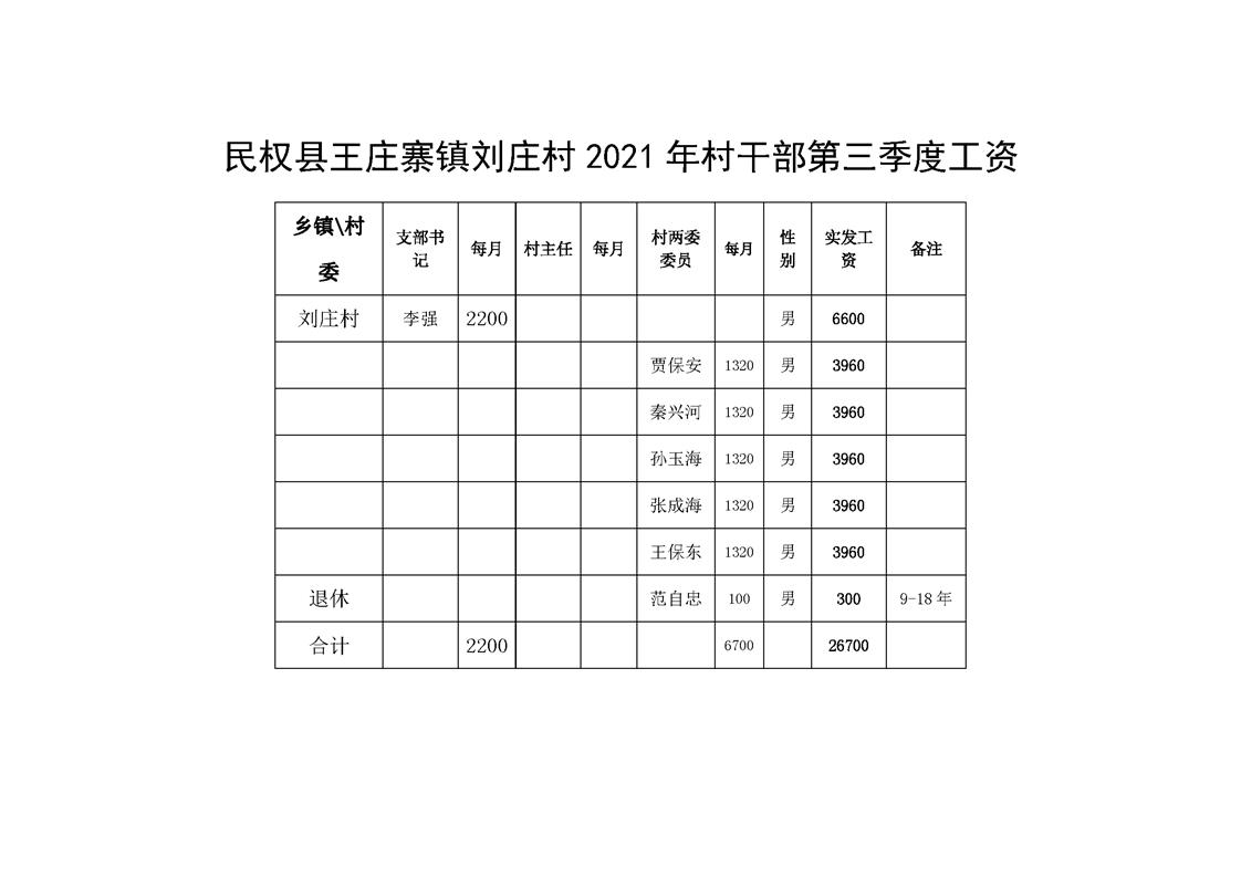 民权县王庄寨镇刘庄村2021年村干部第三季度工资
