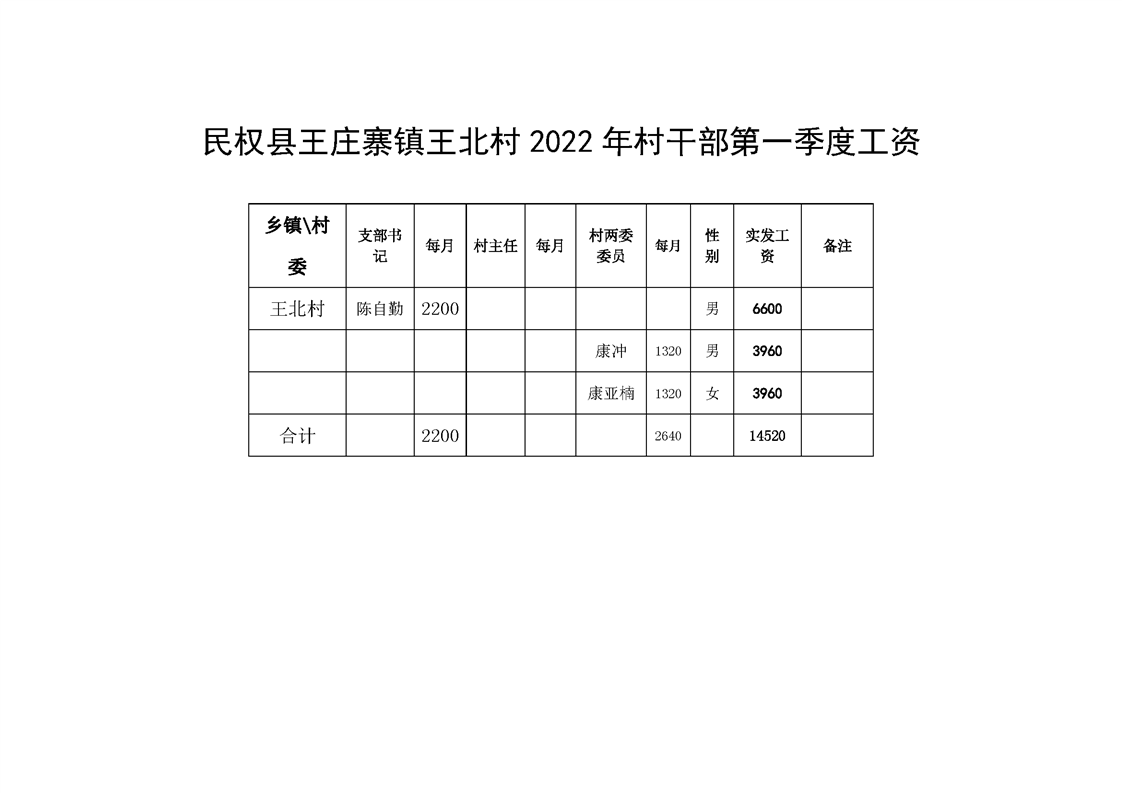 民权县王庄寨镇王北村2022年村干部第一季度工资