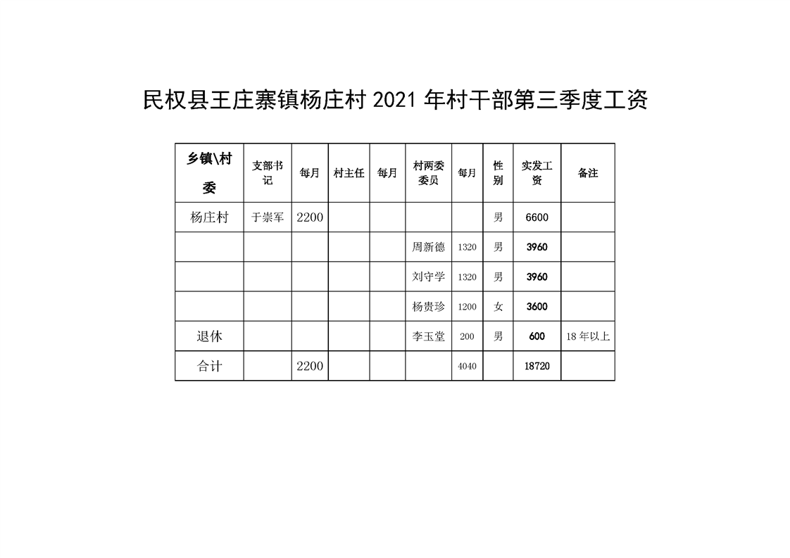 民权县王庄寨镇杨庄村2021年村干部第三季度工资