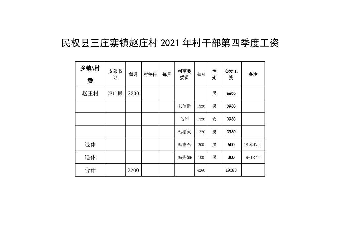 民权县王庄寨镇赵庄村2021年村干部第四季度工资