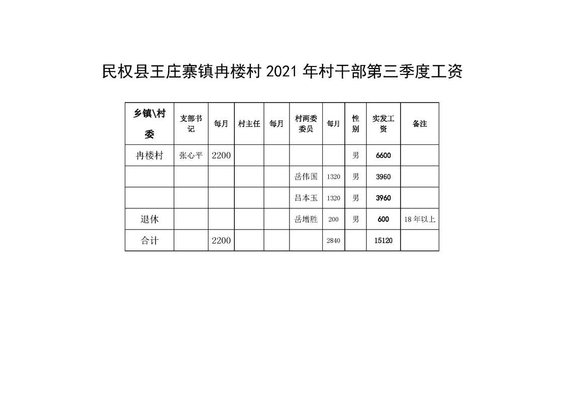 民权县王庄寨镇冉楼村2021年村干部第三季度工资
