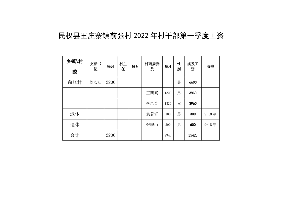 民权县王庄寨镇前张村2022年村干部第一季度工资