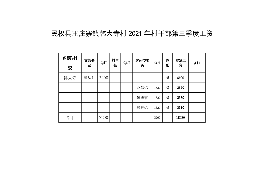 民权县王庄寨镇韩大寺村2021年村干部第三季度工资