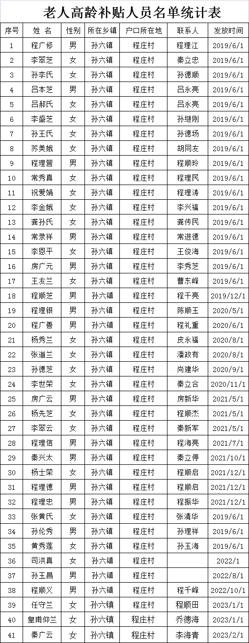 程庄村老人高龄补贴人员名单统计表