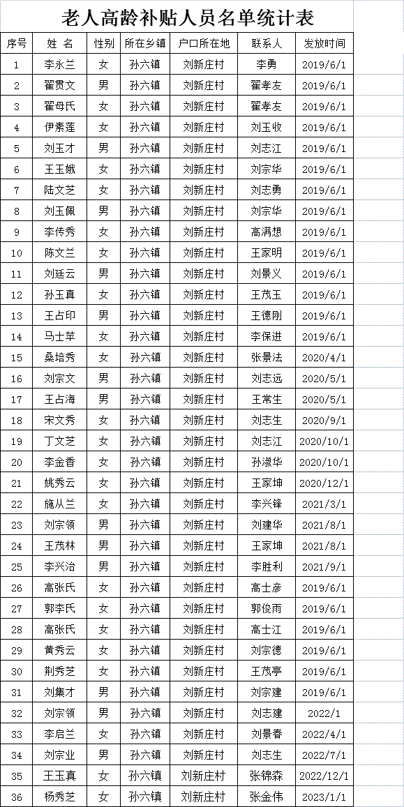 刘新庄村老人高龄补贴人员名单统计表
