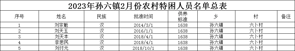 六卜村2023年2月特困人员名单