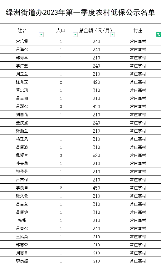 绿洲街道办2023年第一季度农村低保公示名单