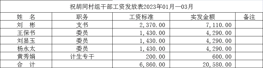 祝胡洞村2023年第一季度村干部工资