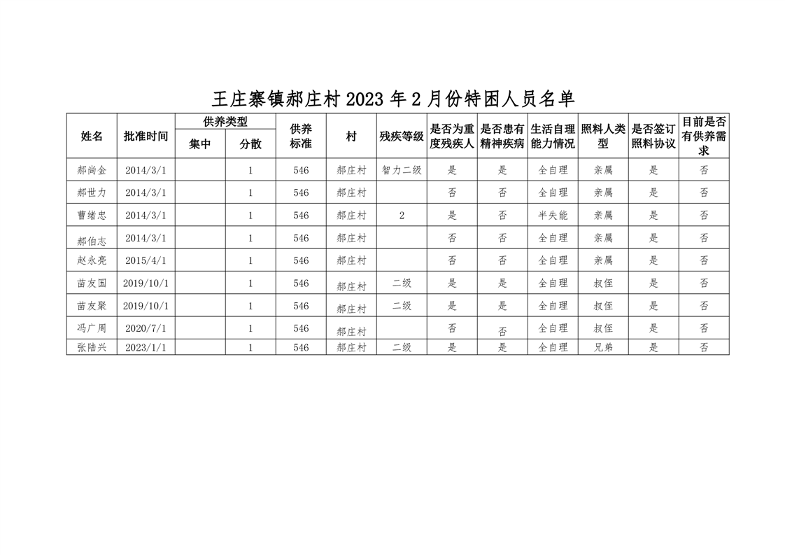 王庄寨镇郝庄村 2023 年 2月份特困人员名单