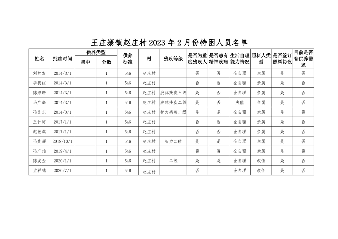 王庄寨镇赵庄村 2023 年 2月份特困人员名单