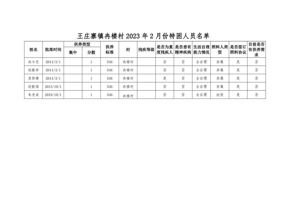 王庄寨镇冉楼村 2023 年 2月份特困人员名单
