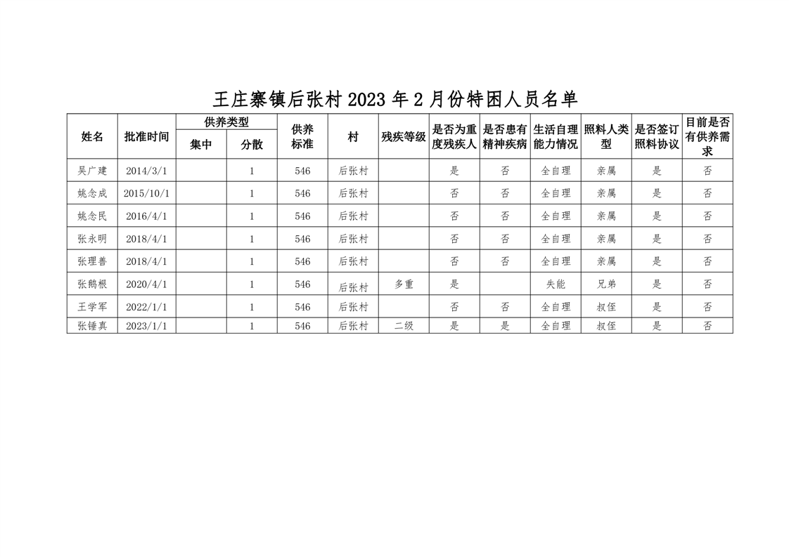 王庄寨镇后张村 2023 年 2月份特困人员名单