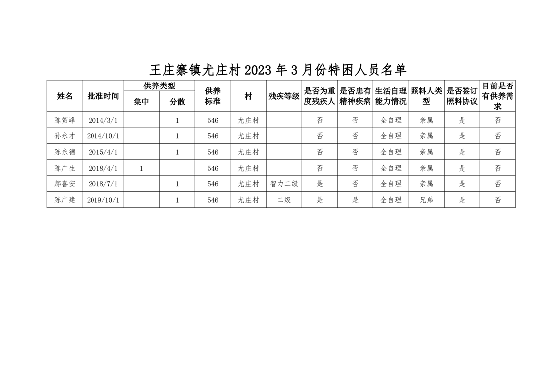 王庄寨镇尤庄村 2023 年3月份特困人员名单