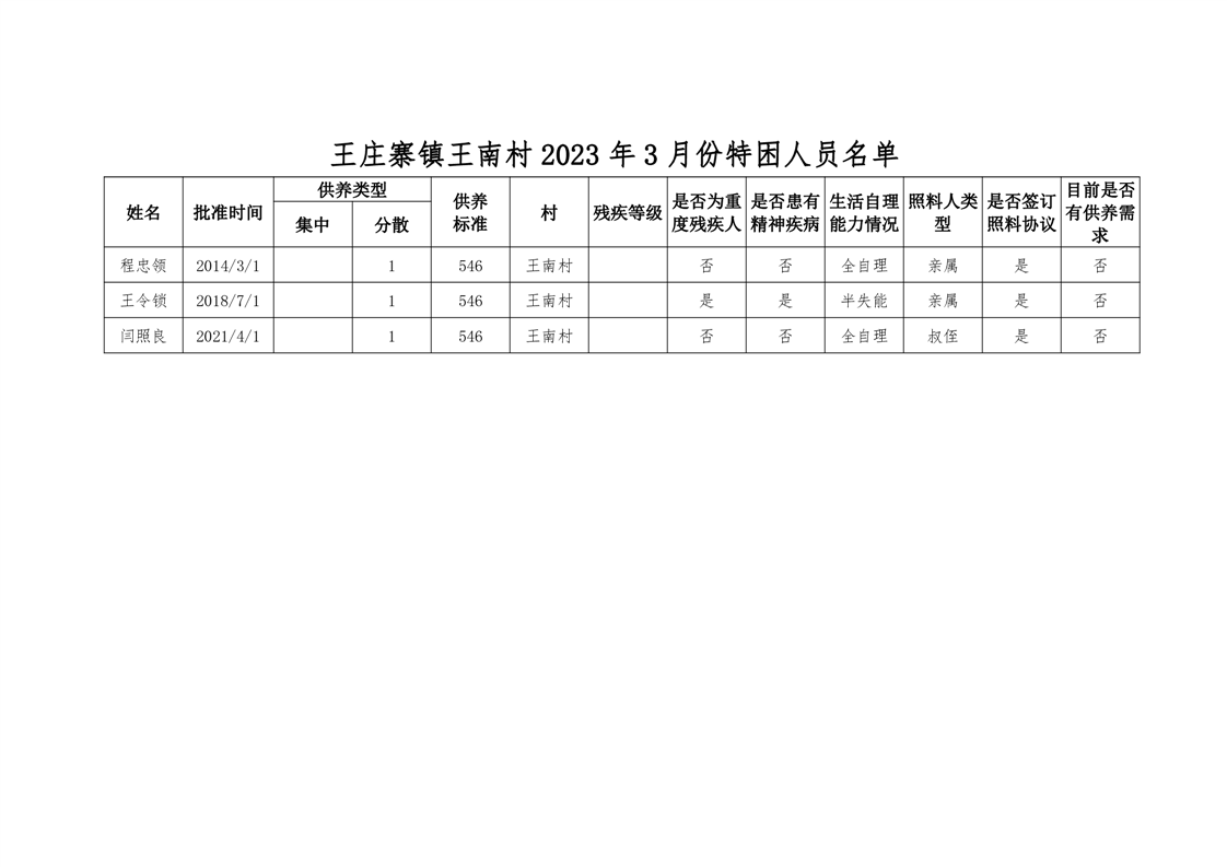王庄寨镇王南村 2023 年3月份特困人员名单