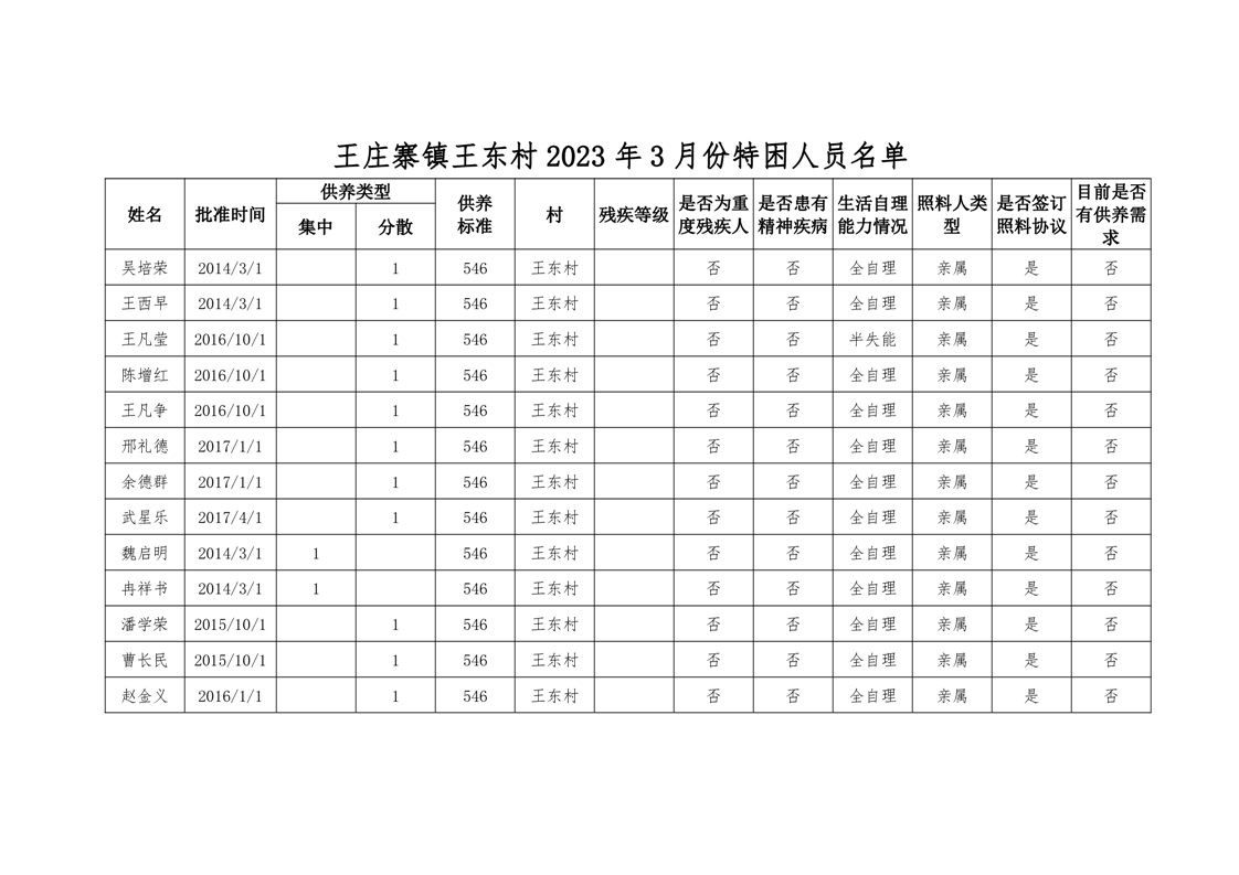 王庄寨镇王东村 2023 年3月份特困人员名单