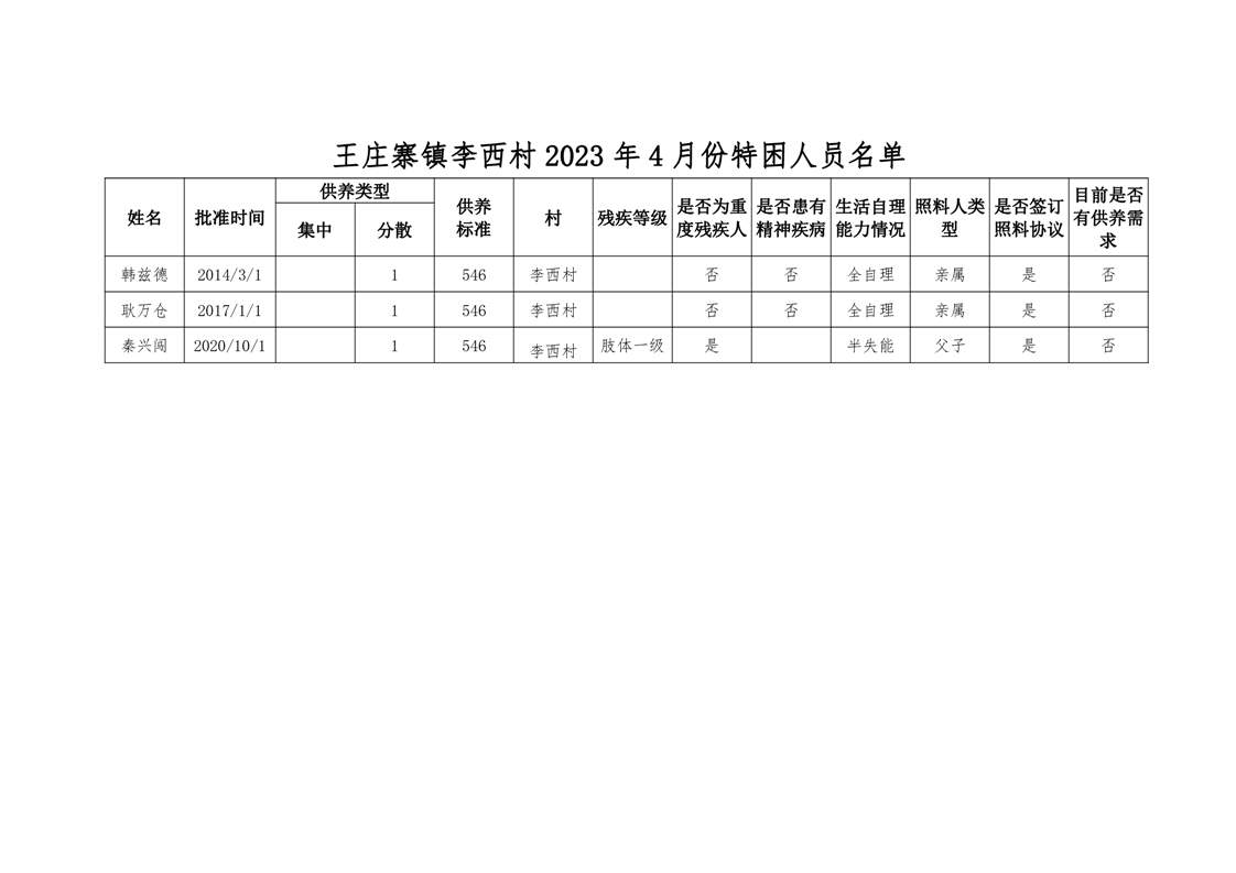 王庄寨镇李西村 2023 年4月份特困人员名单