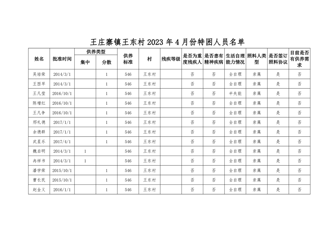王庄寨镇王东村 2023 年4月份特困人员名单