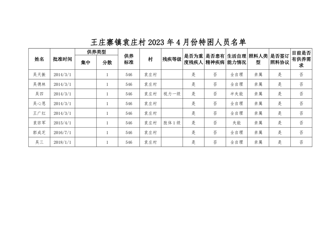 王庄寨镇袁庄村 2023 年4月份特困人员名单
