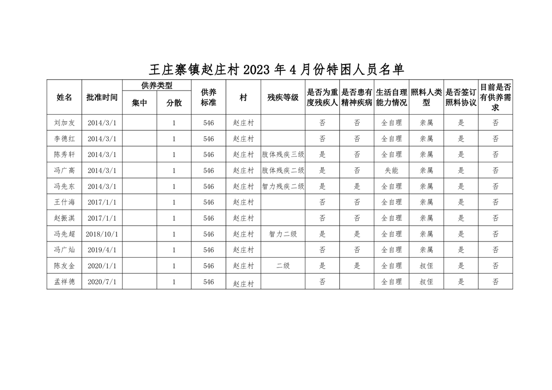 王庄寨镇赵庄村 2023 年4月份特困人员名单