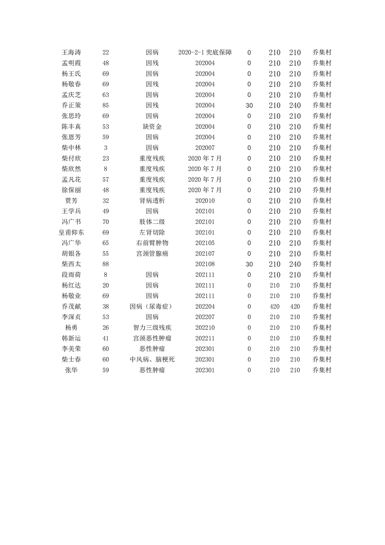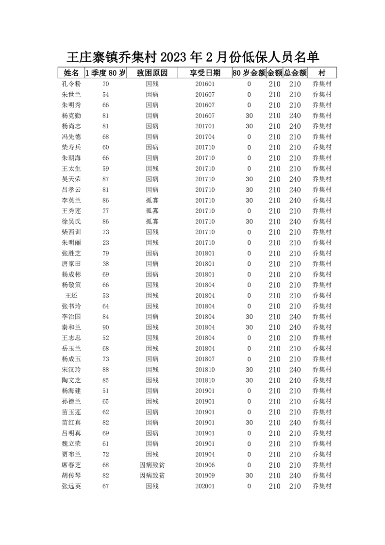 王庄寨镇乔集村2023年2月份农村低保名单