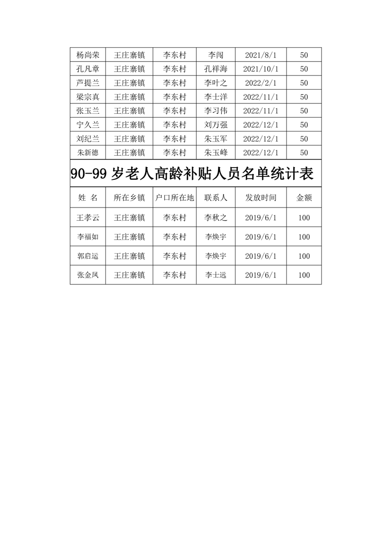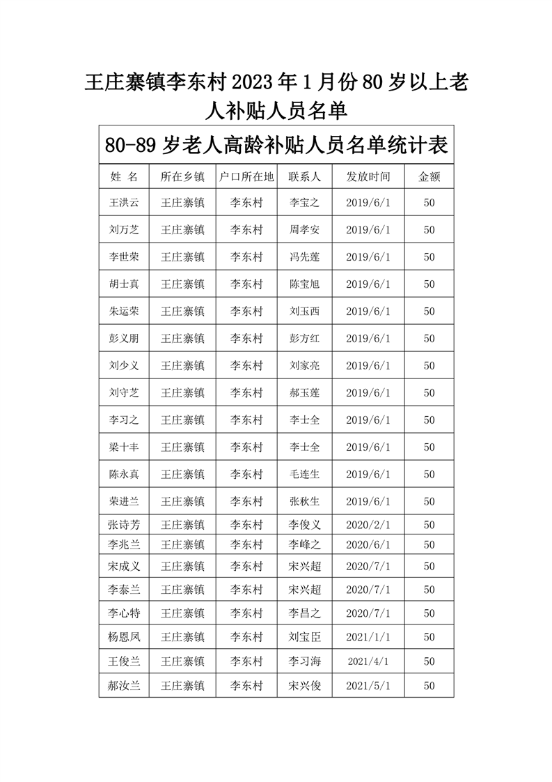 王庄寨镇李东村2023年1月份高龄补贴 人员名单统计表