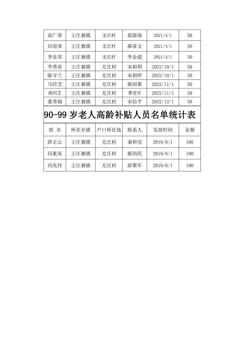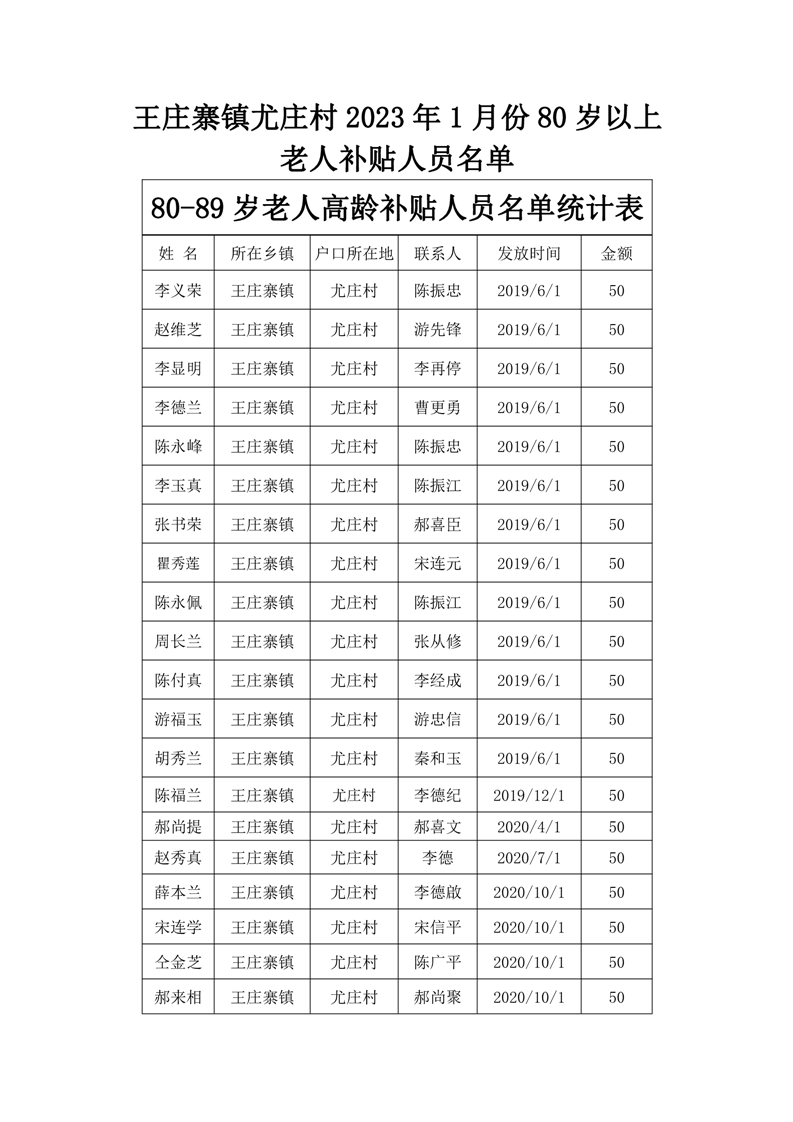 王庄寨镇尤庄村2023年1月份高龄补贴 人员名单统计表
