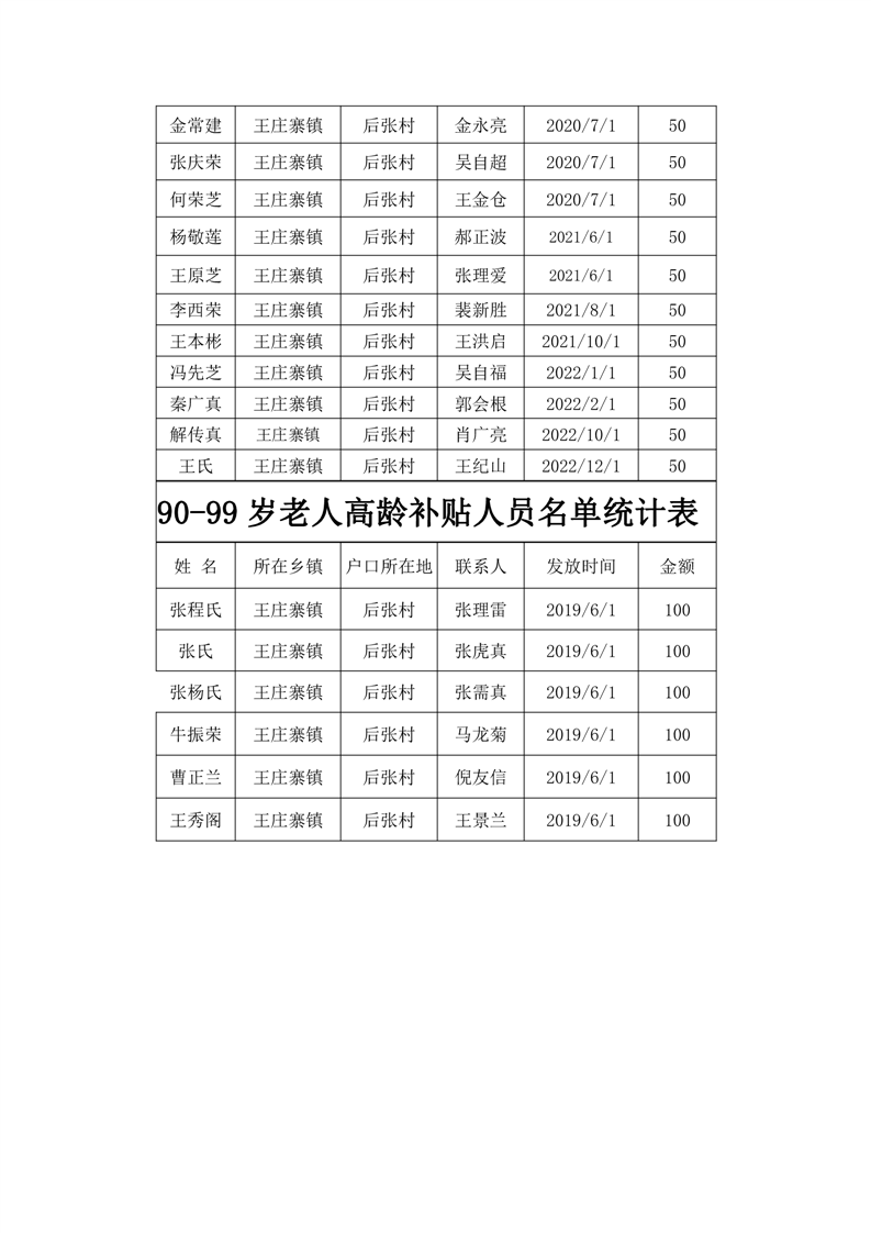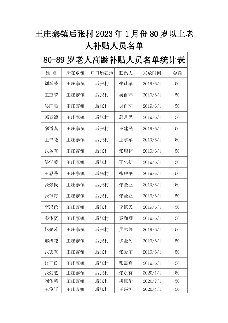 王庄寨镇后张村2023年1月份高龄补贴 人员名单统计表