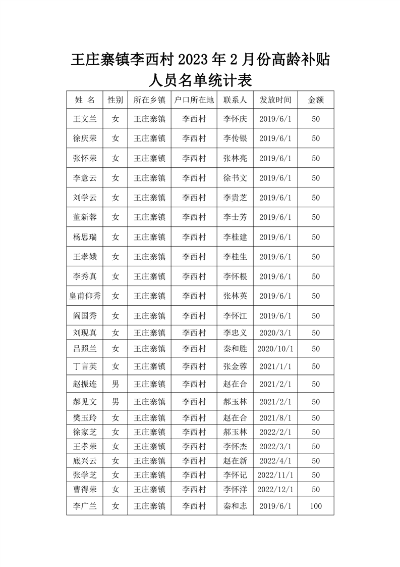 王庄寨镇李西村2023年2月份高龄补贴 人员名单统计表