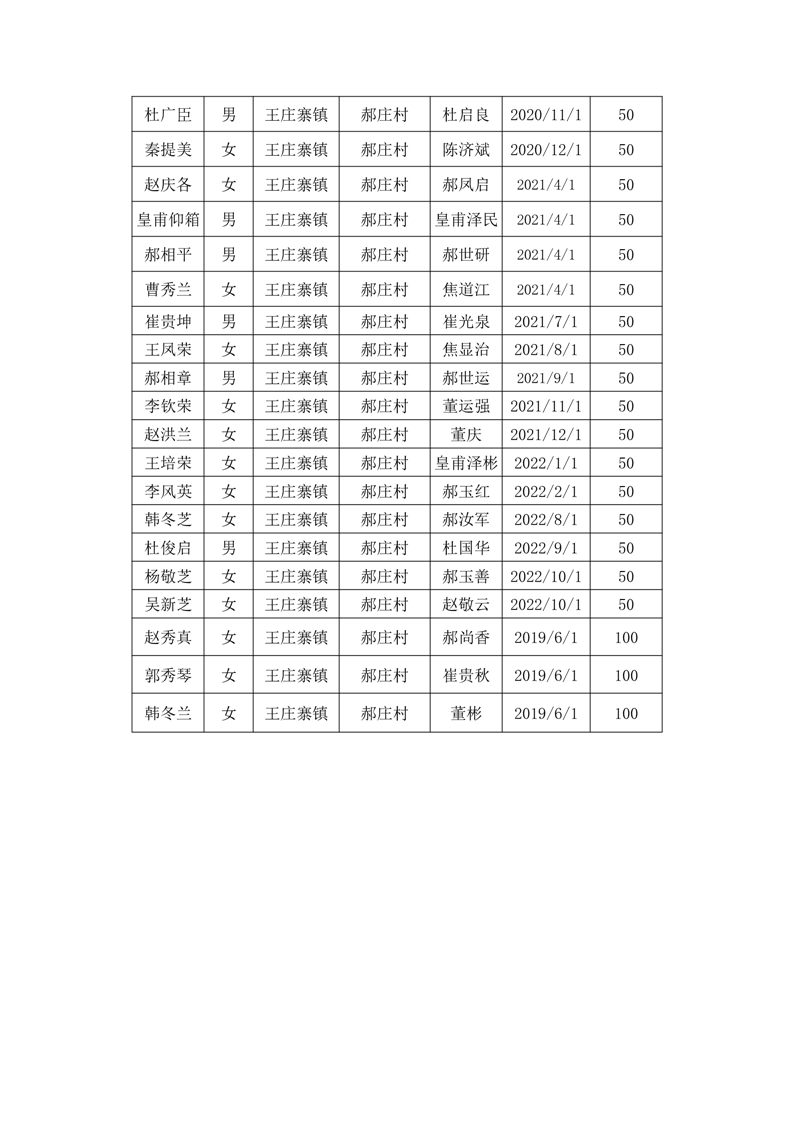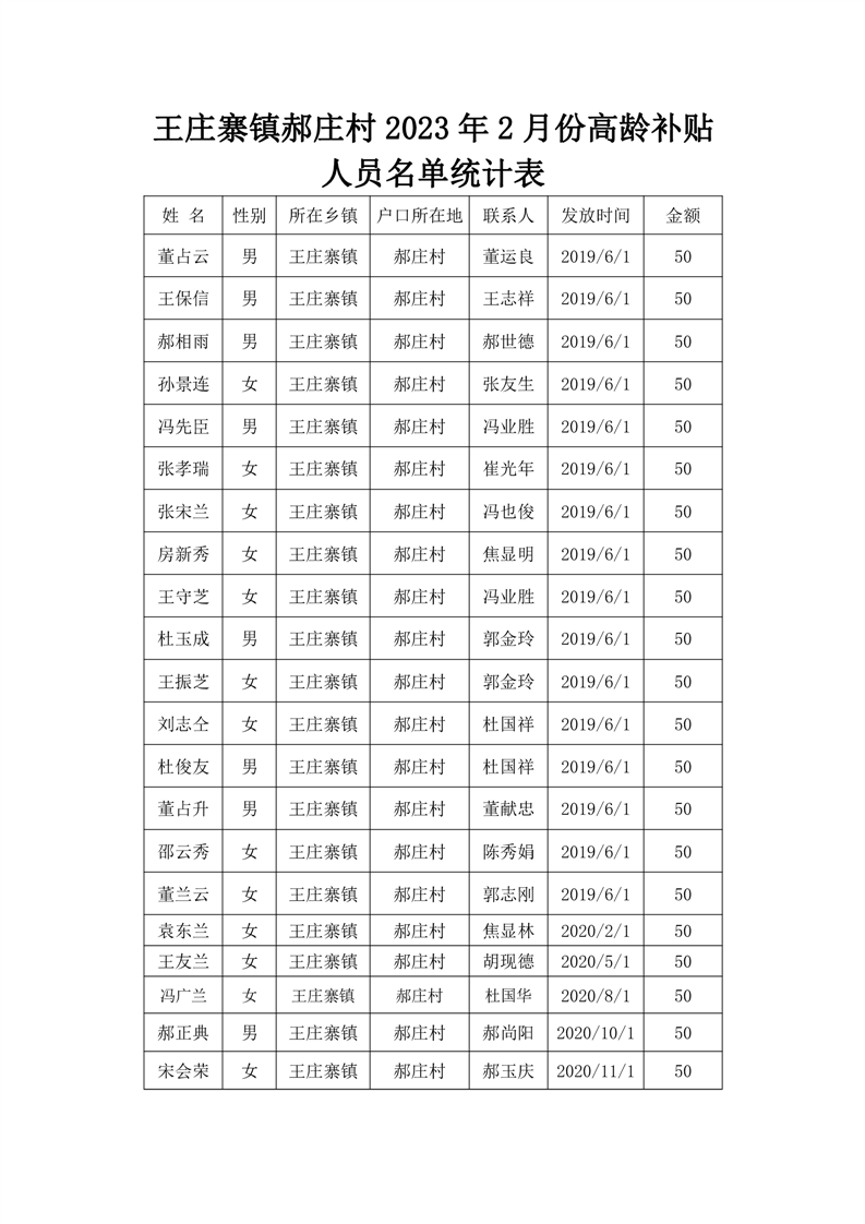 王庄寨镇郝庄村2023年2月份高龄补贴 人员名单统计表