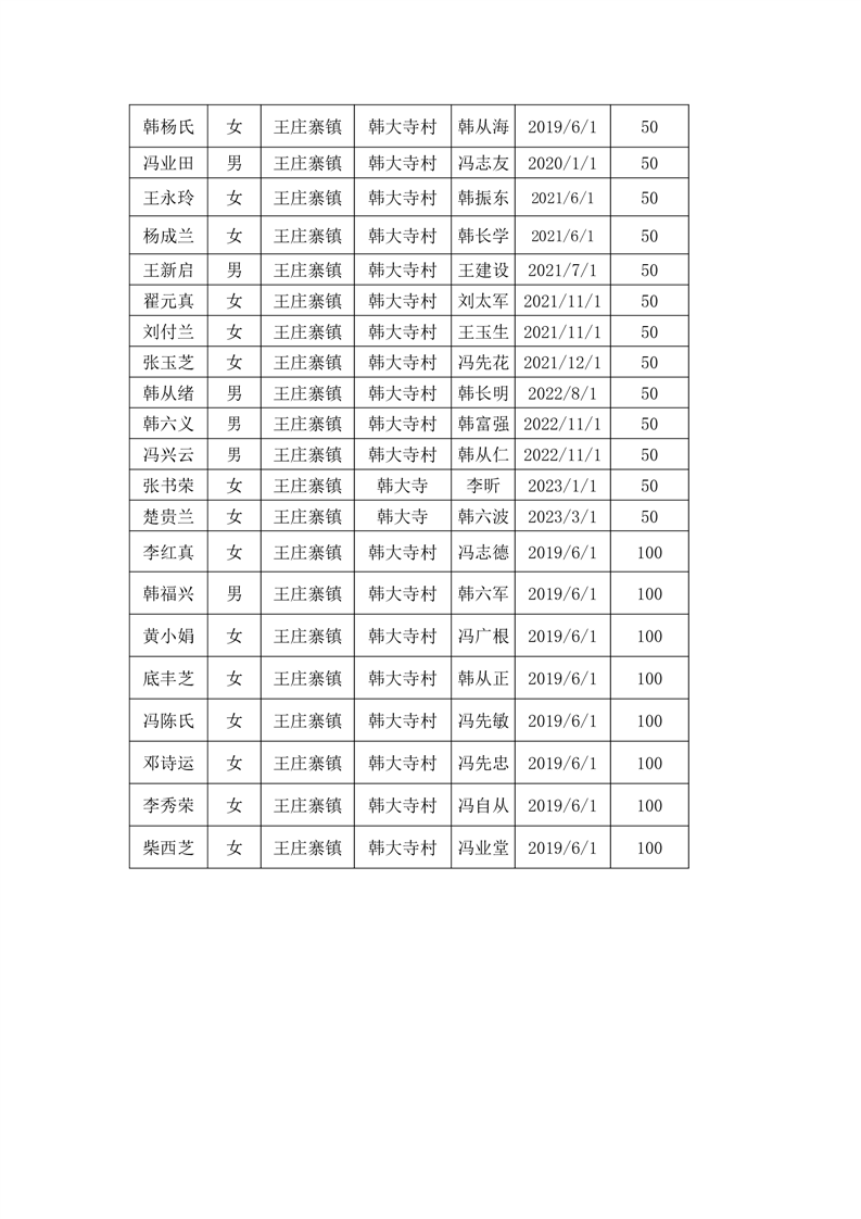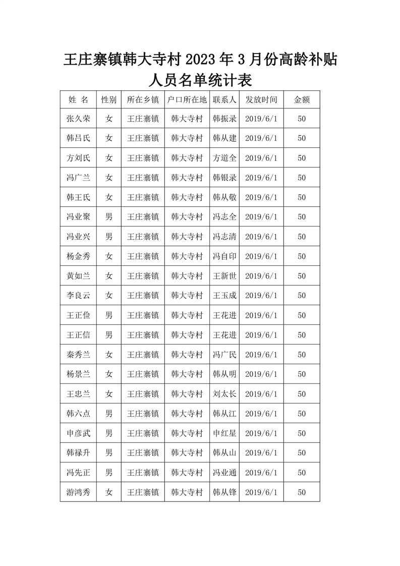 王庄寨镇韩大寺村2023年3月份高龄补贴 人员名单统计表