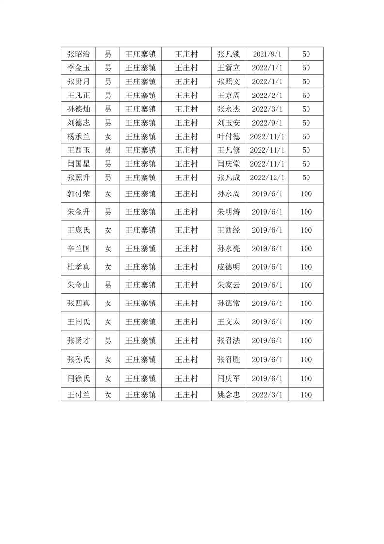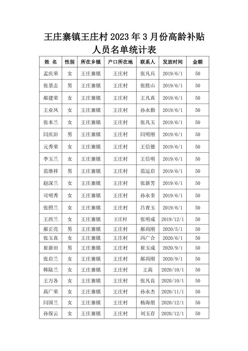 王庄寨镇王庄村2023年3月份高龄补贴 人员名单统计表
