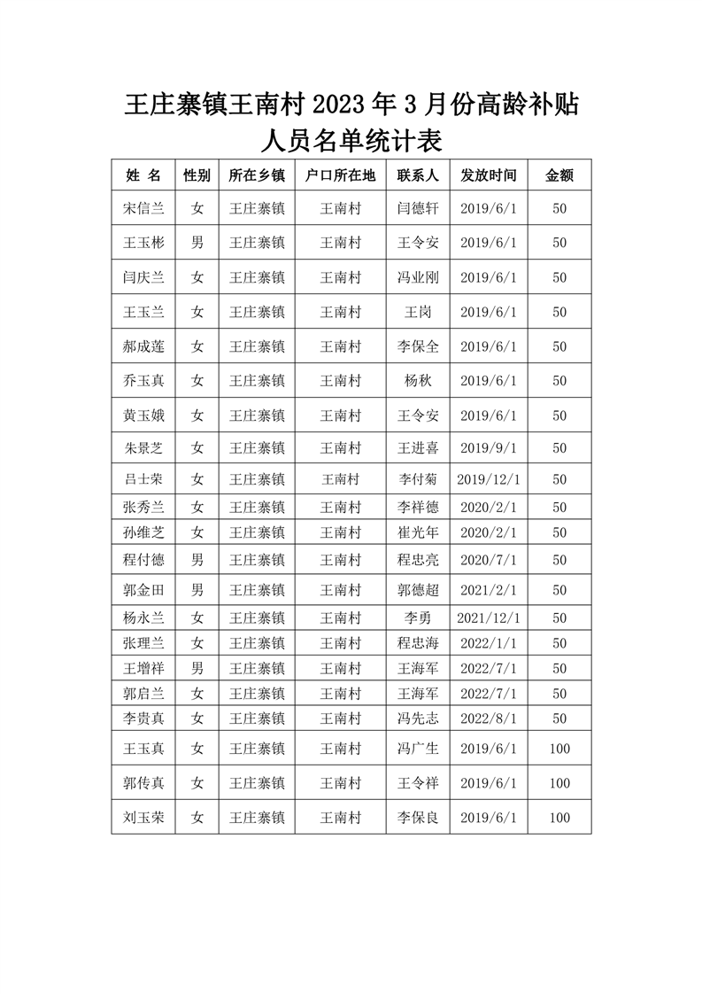 王庄寨镇王南村2023年3月份高龄补贴 人员名单统计表