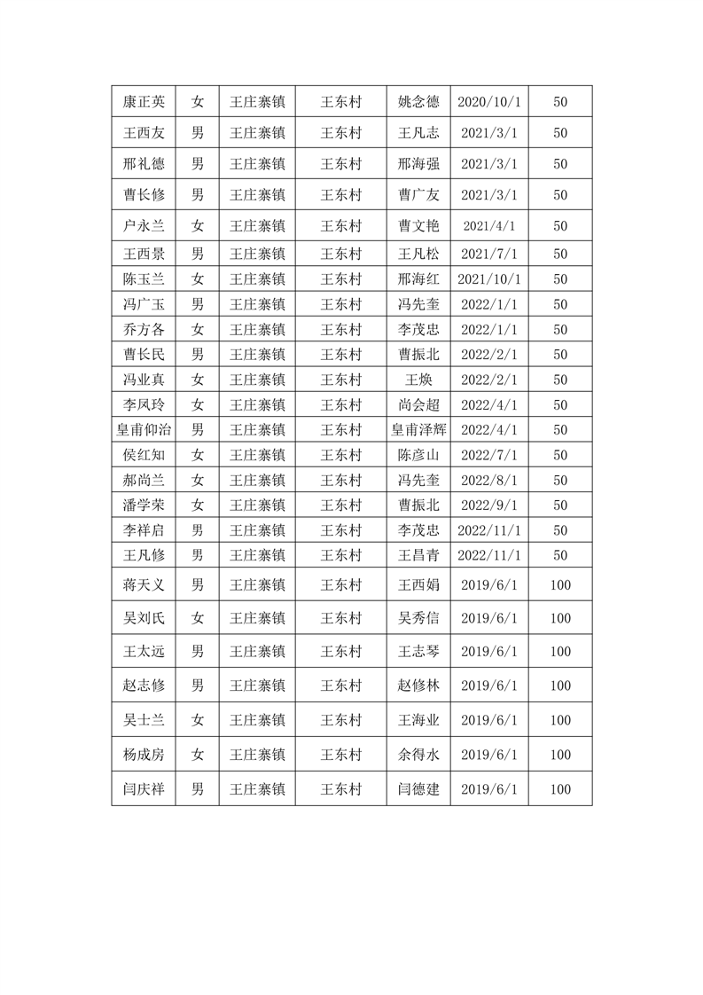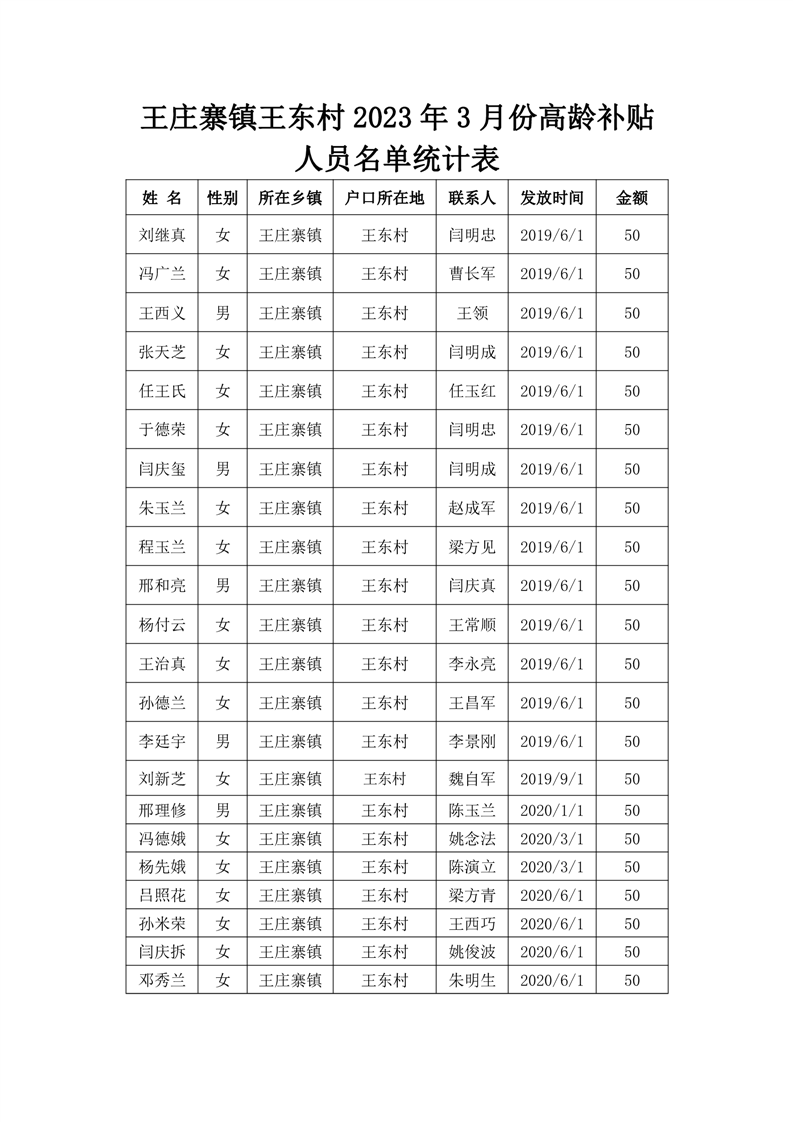 王庄寨镇王东村2023年3月份高龄补贴 人员名单统计表