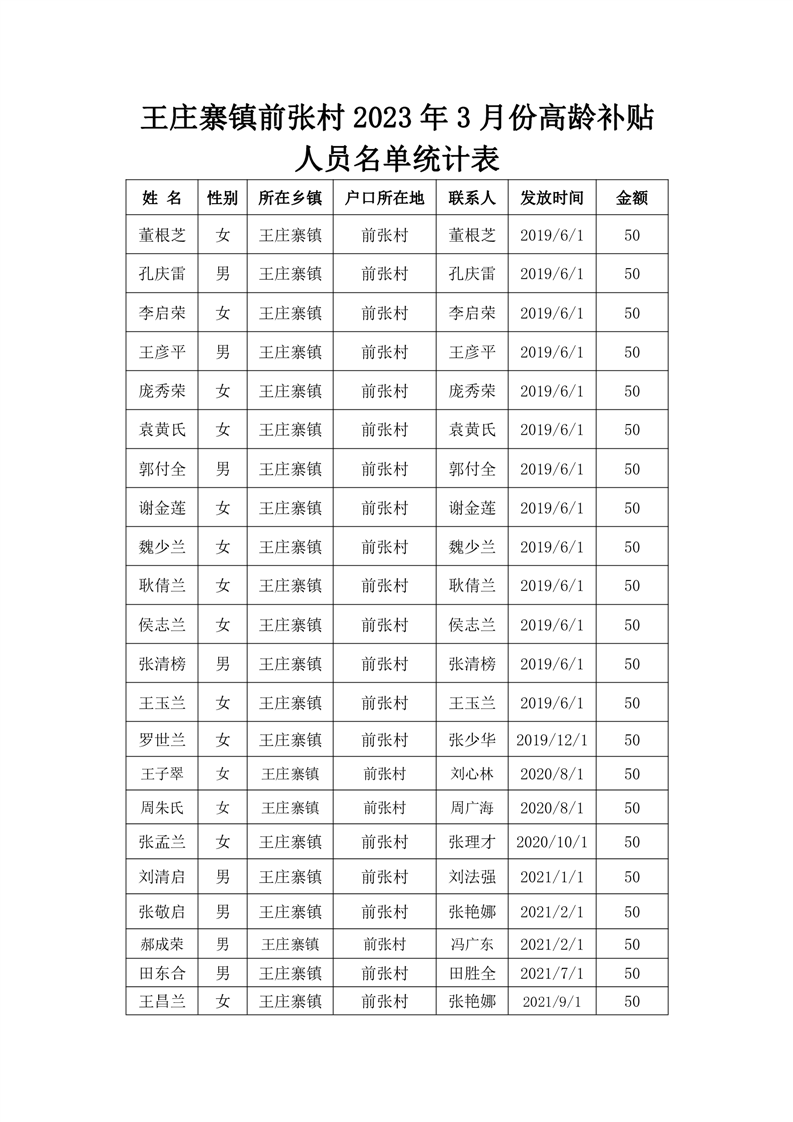 王庄寨镇前张村2023年3月份高龄补贴 人员名单统计表