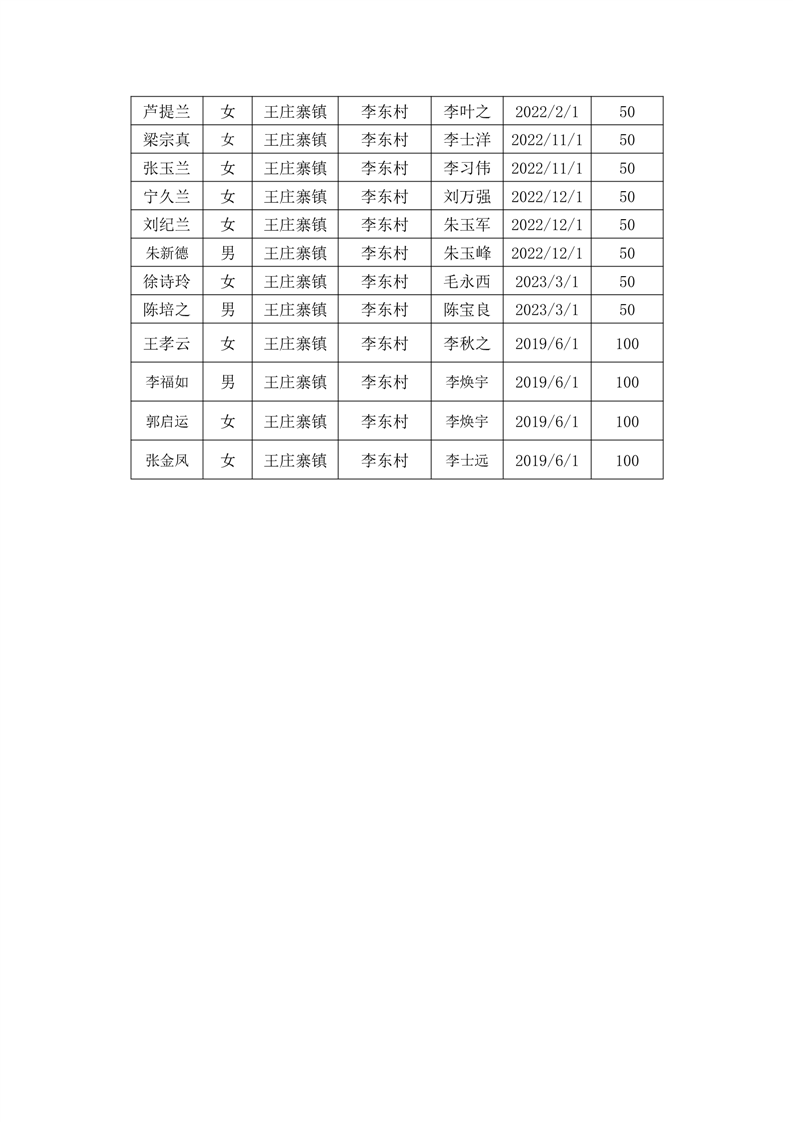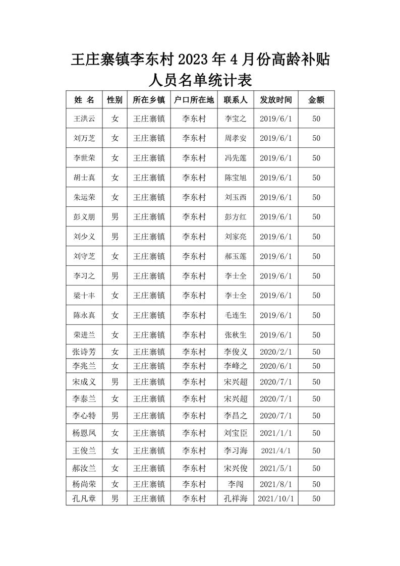 王庄寨镇李东村2023年4月份高龄补贴 人员名单统计表