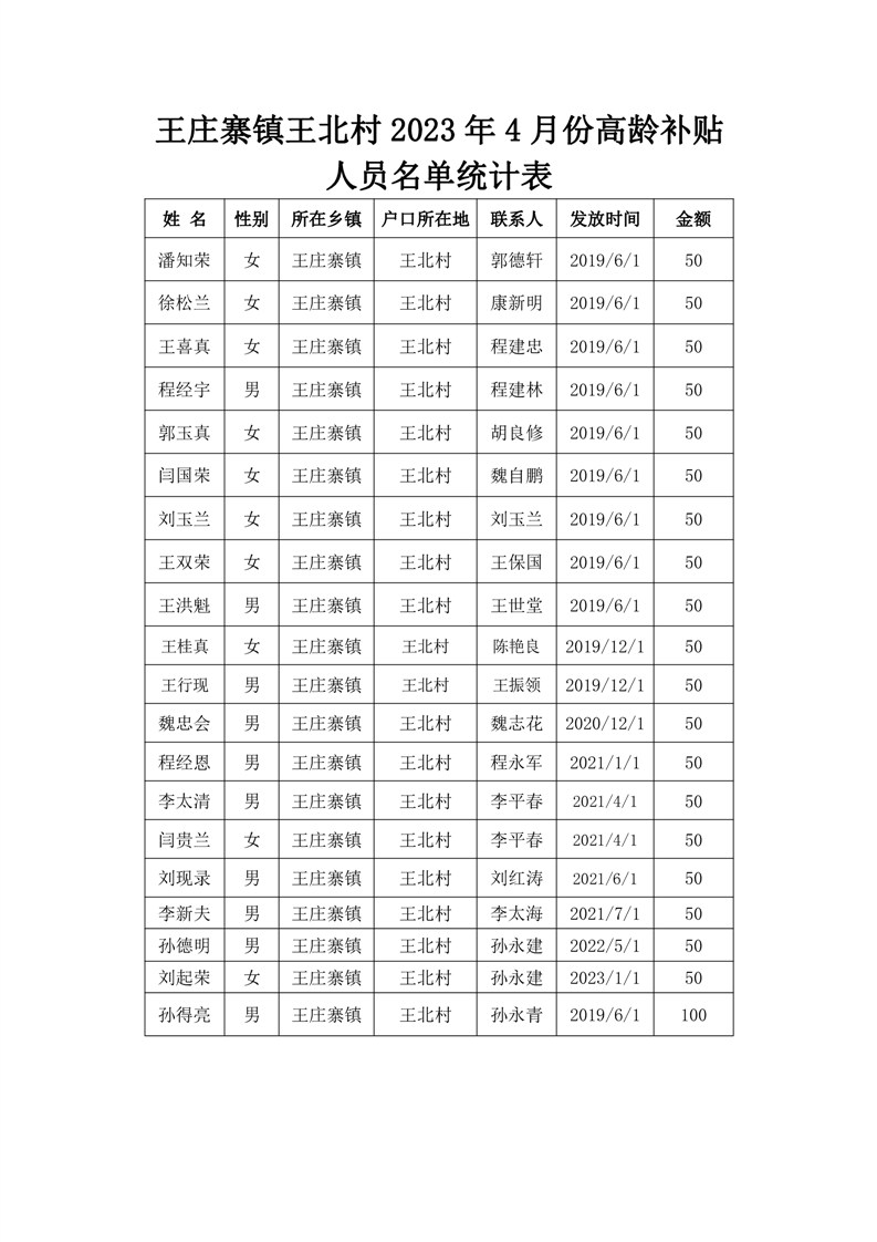 王庄寨镇王北村2023年4月份高龄补贴 人员名单统计表