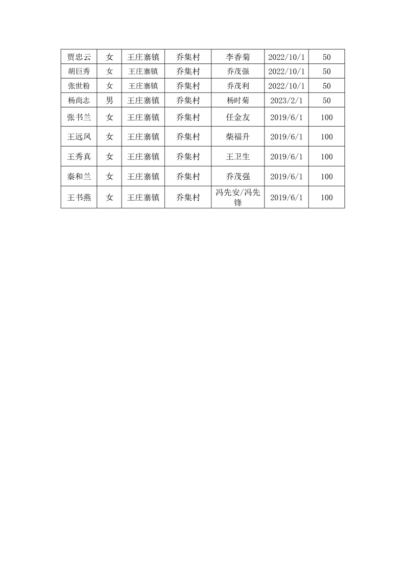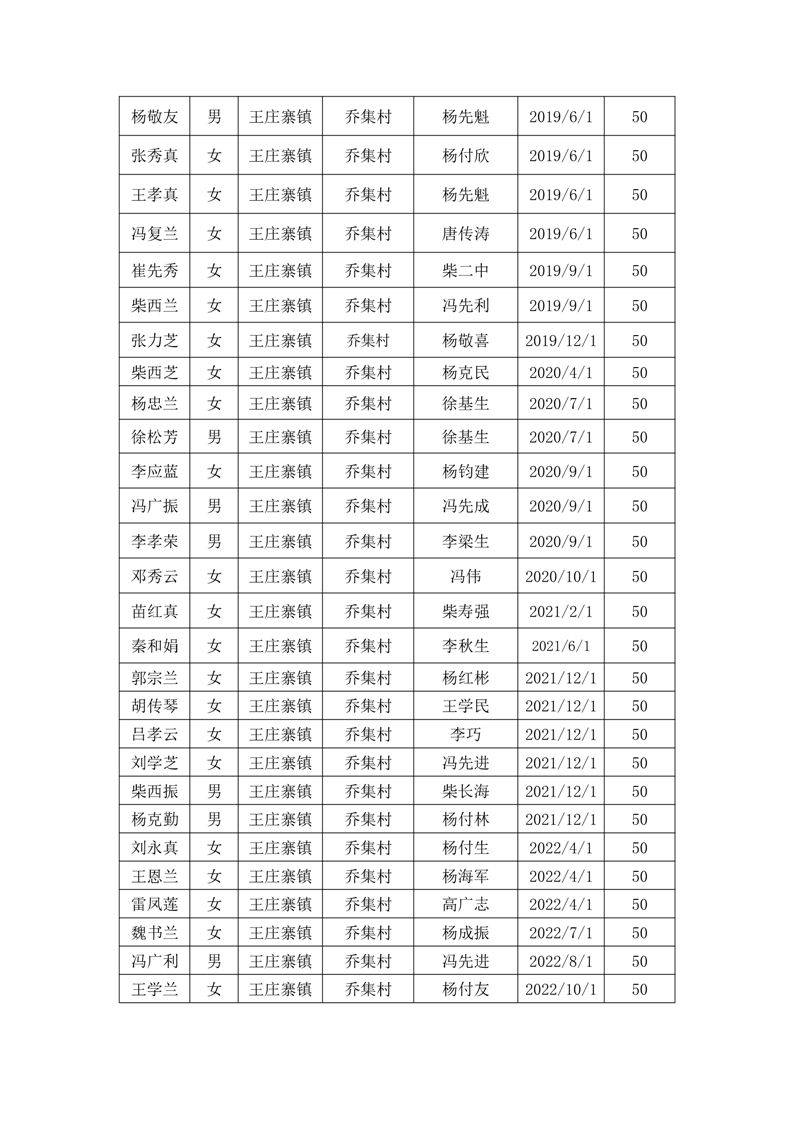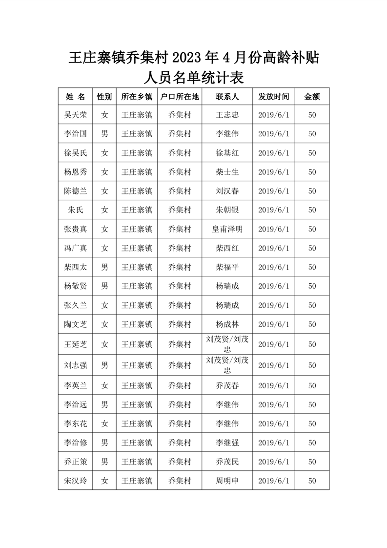 王庄寨镇乔集村2023年4月份高龄补贴 人员名单统计表