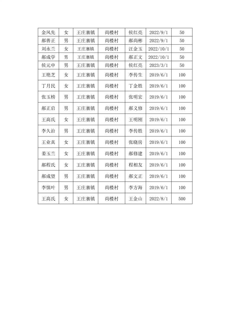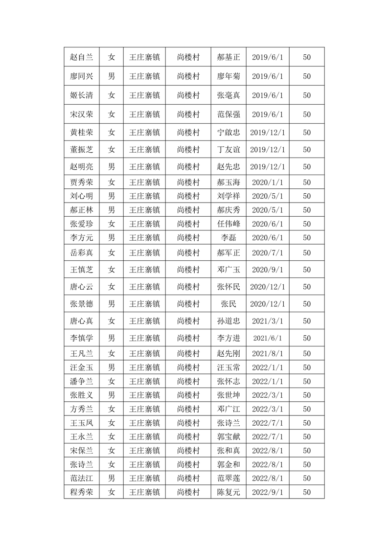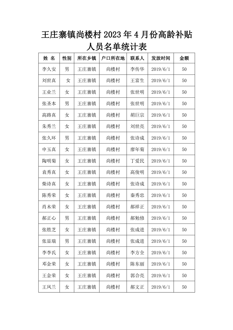 王庄寨镇尚楼村2023年4月份高龄补贴 人员名单统计表