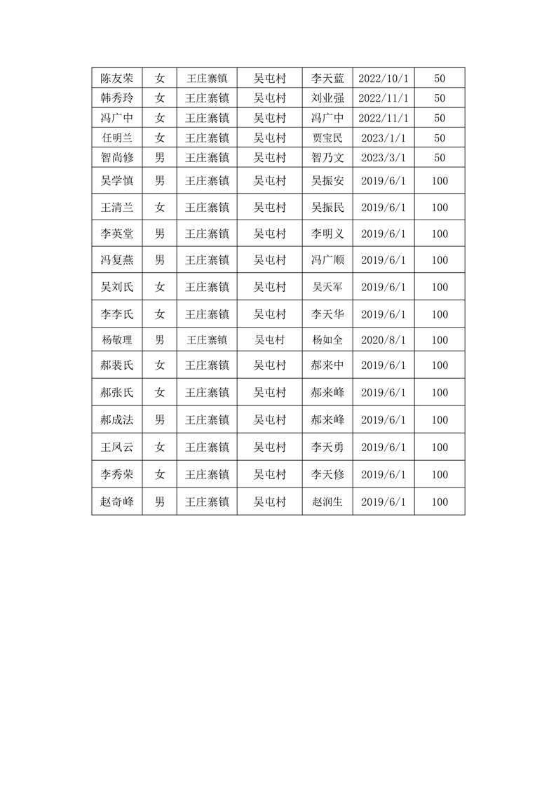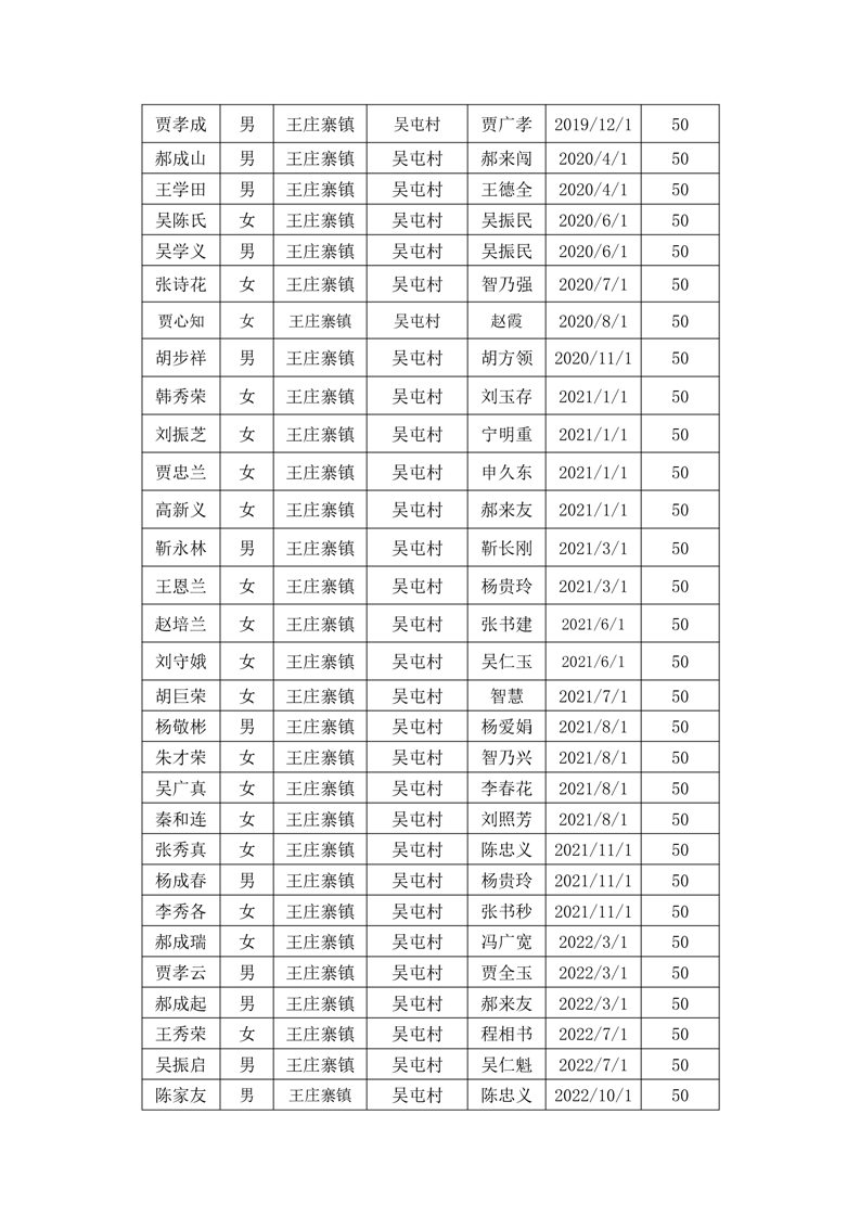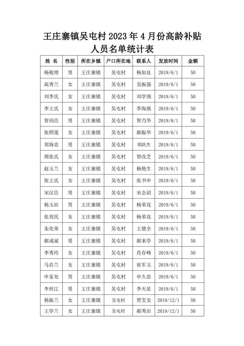 王庄寨镇吴屯村2023年4月份高龄补贴 人员名单统计表