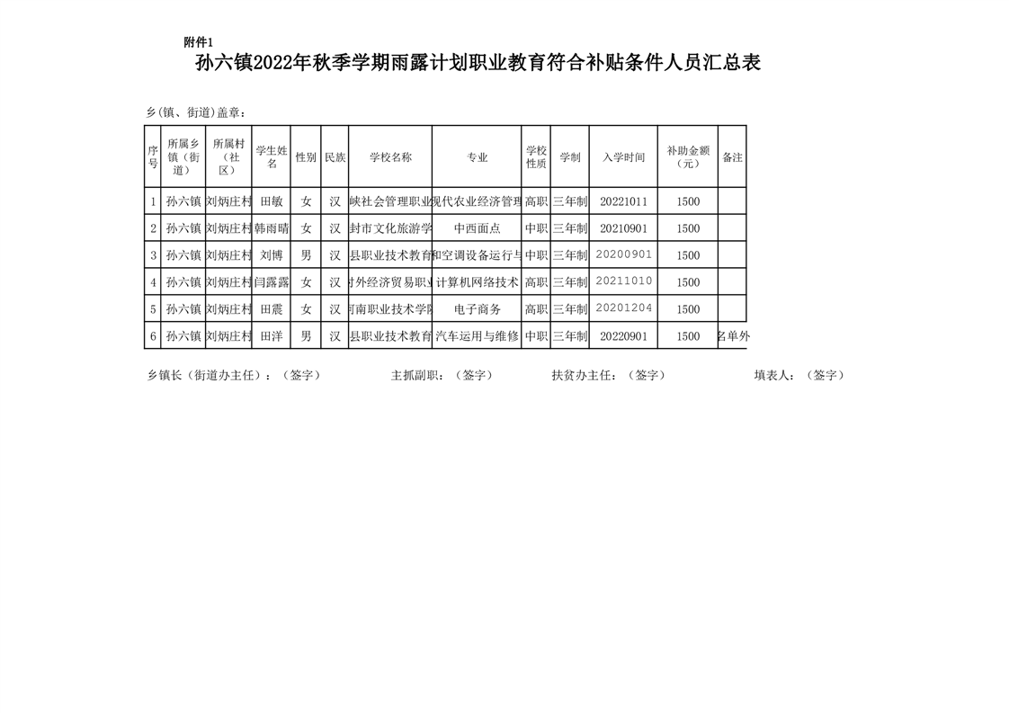 刘炳庄村2022年秋季学期雨露计划职业教育符合补贴条件人员名单