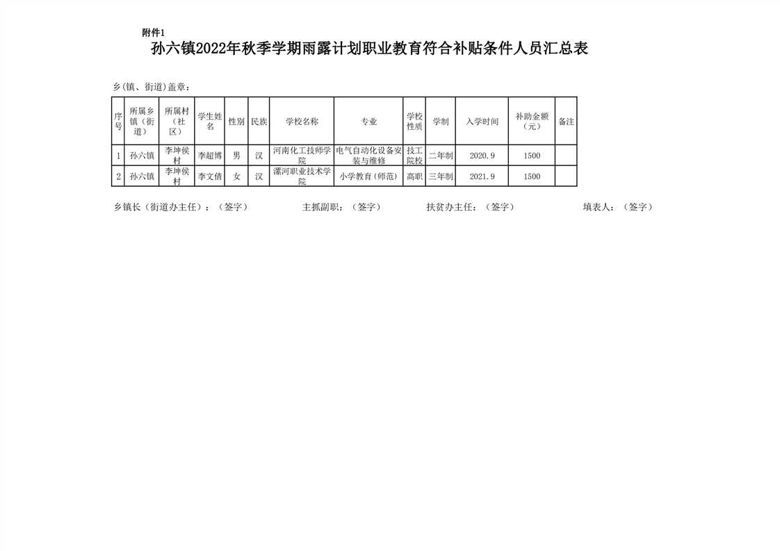 李坤候村2022年秋季学期雨露计划职业教育符合补贴条件人员名单